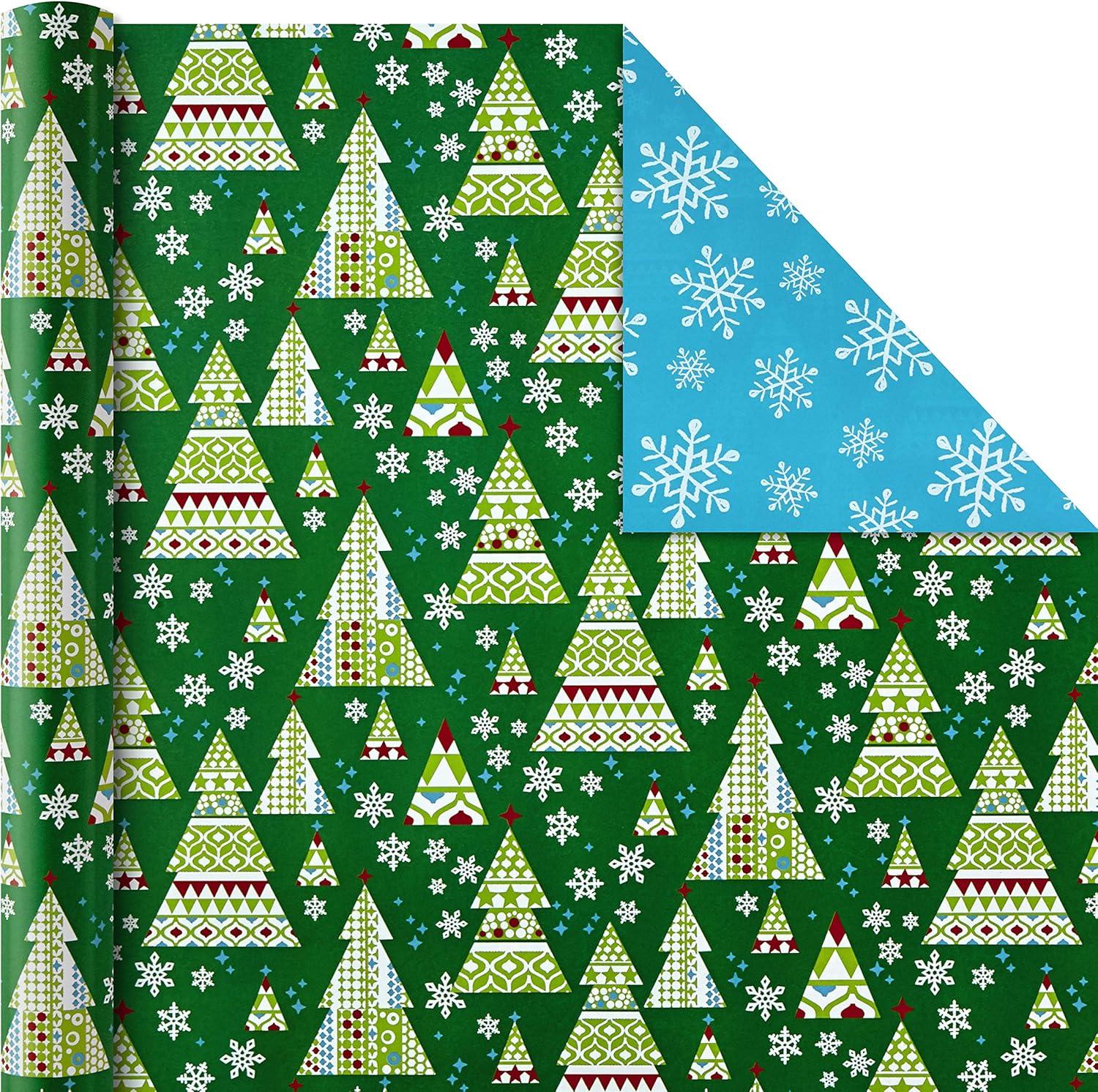 Hallmark Blue Foil Christmas Wrapping Paper with Cut Lines on Reverse (3 Rolls: 60 sq. ft. ttl) Snowmen, Snowflakes, Christmas Trees(Green Plaid Wreath Woodland Scene)