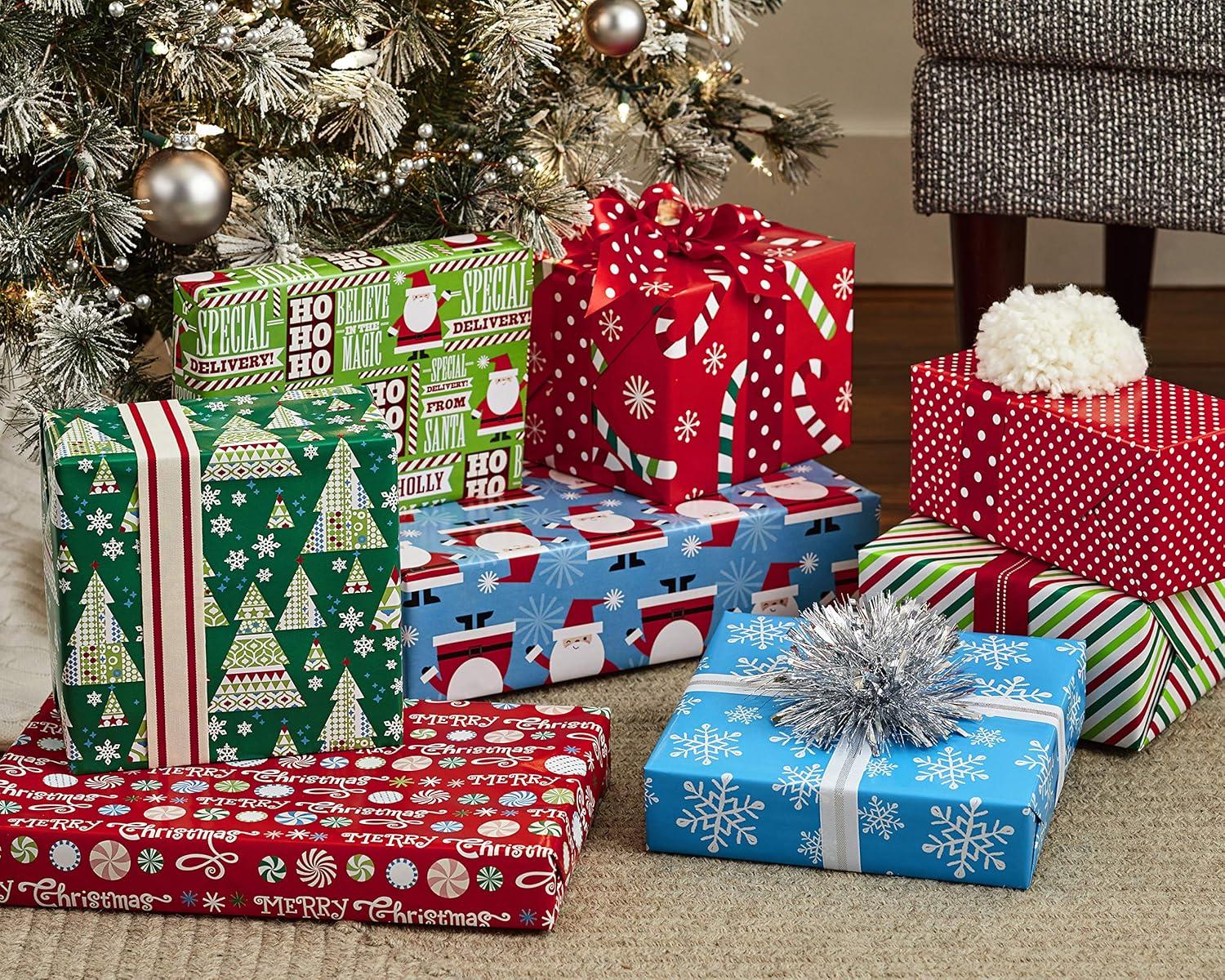 - Our holiday sale features the best deals on Hallmark Kraft Christmas Wrapping Paper for Kids with Cut Lines on Reverse (4 Rolls: 88 sq. ft. ttl) Penguins, Santa, Snowmen, Polka Dots(Red Trucks Snowflakes Red Stripes Merry Christmas) and accessories. Shop now and save!