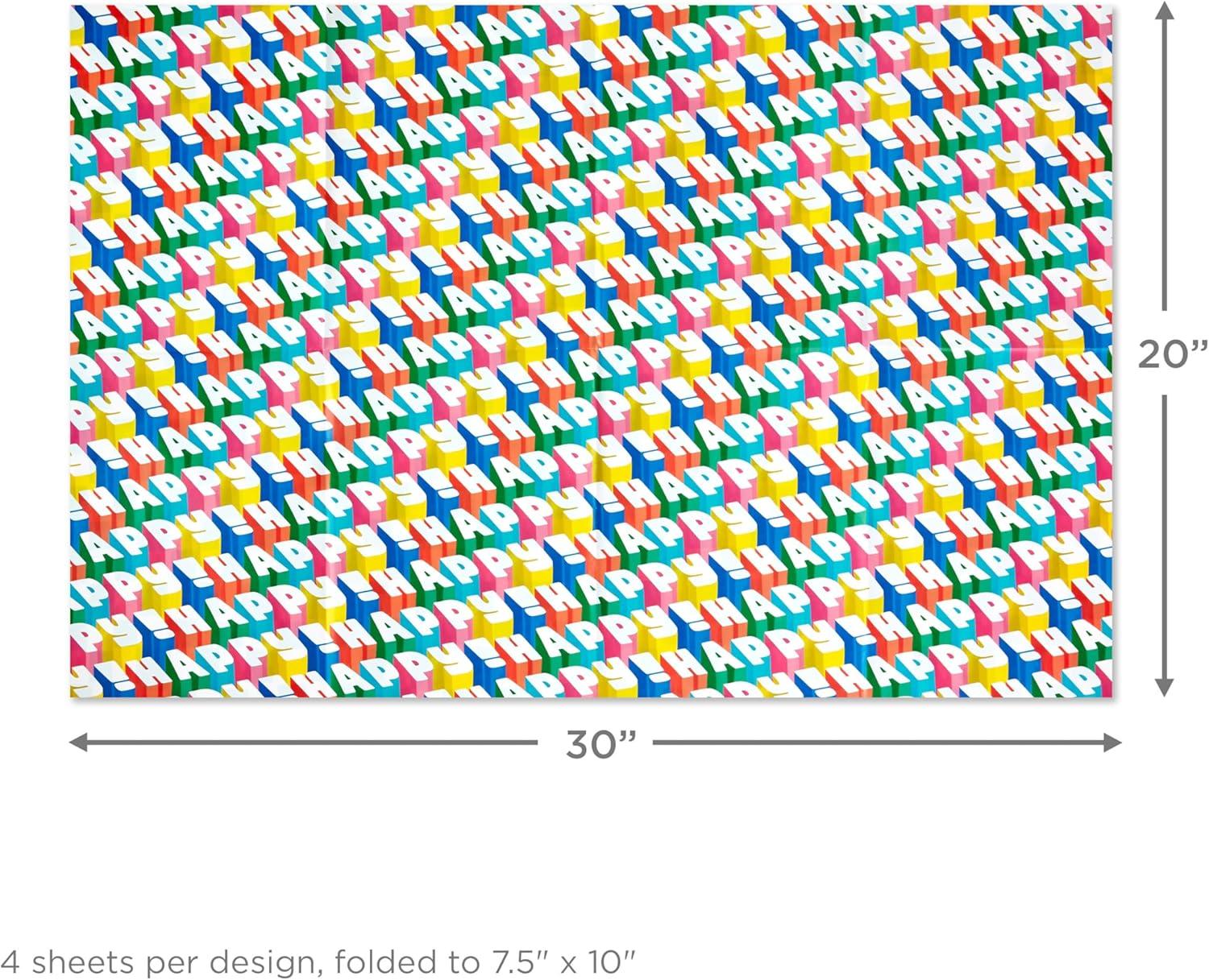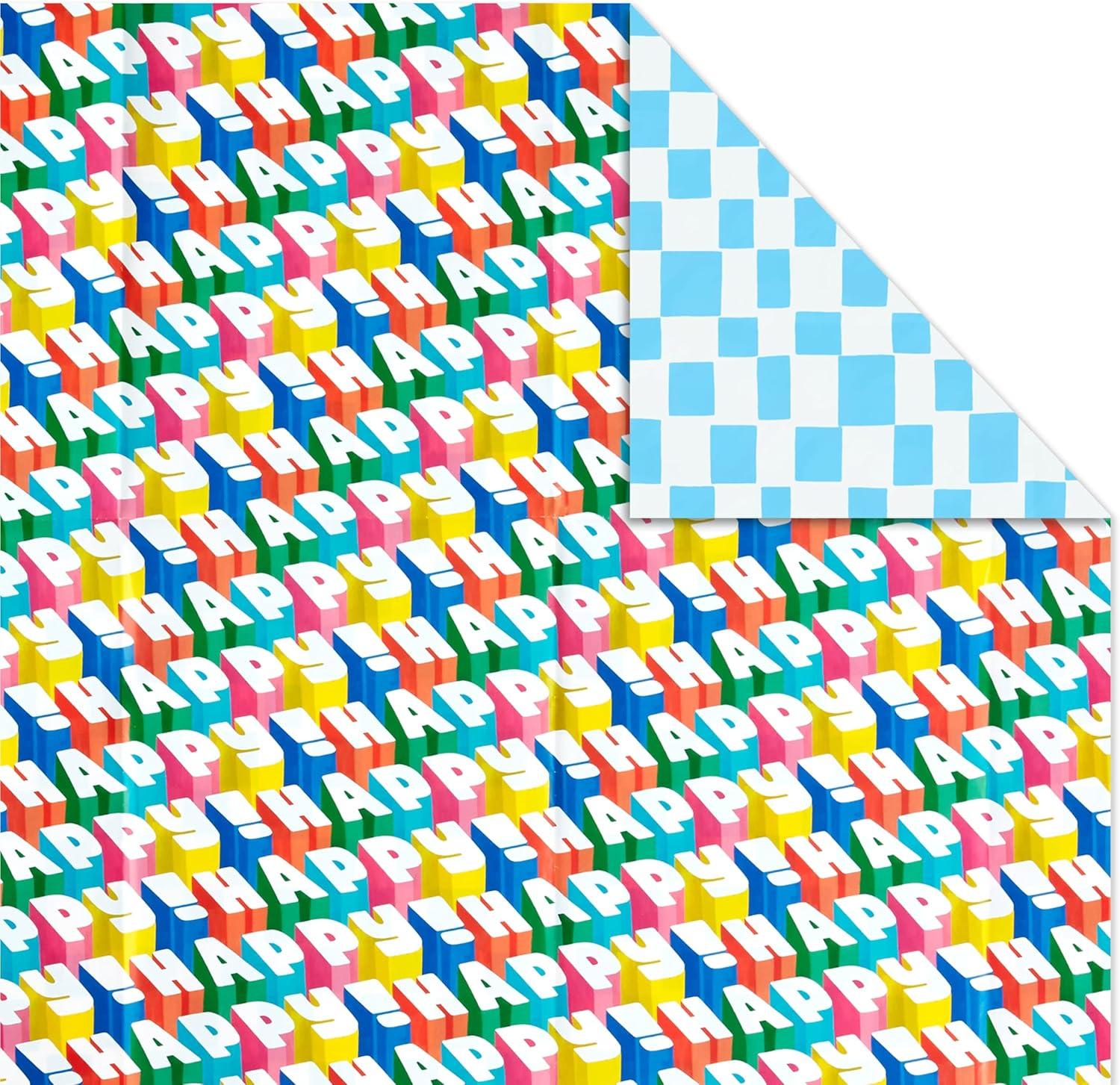 Hallmark Reversible Flat Wrapping Paper Sheets (12 Folded Sheets with Sticker Seals) Rainbow Happy, Exclamation Points, Polka Dots, Confetti for Birthdays, Graduations, Celebrations(Blue Red Dark Blue and Multicolor)