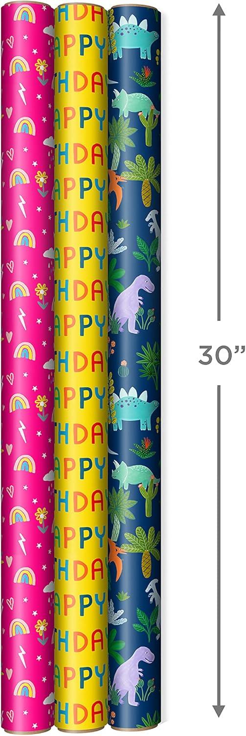 Hallmark Reversible Kids Birthday Wrapping Paper, Monsters and Unicorns (Pack of 3, 120 sq. ft. ttl.)(Rainbows Dinosaurs “Happy Birthday”)
