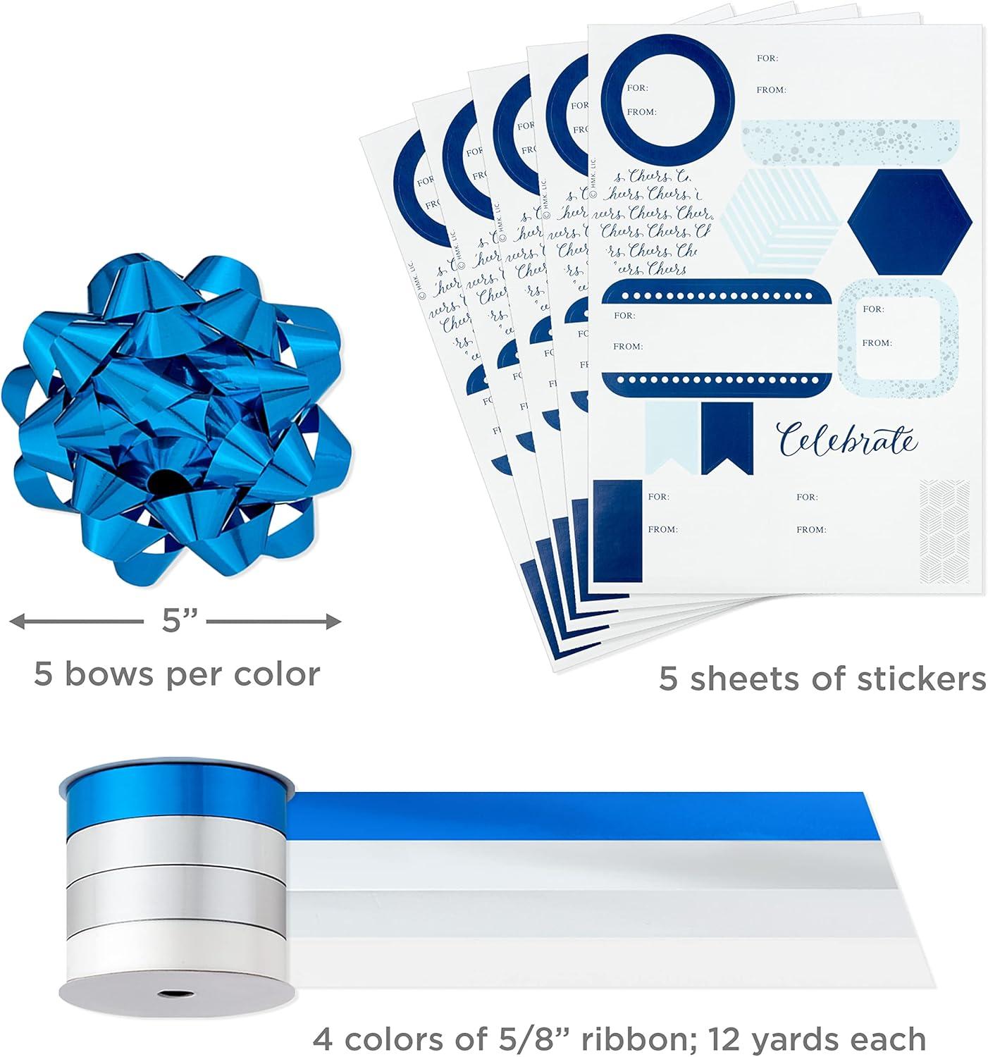 Hallmark Reversible Wrapping Paper Bundle with Ribbon & Gift Tag Stickers – Black, Gold Stripes, Plaid (3 Pack, 120 sq. ft. TTL, 30 Yds. Mini Ribbon, 36 Labels) for Graduations, Weddings, Christmas(Blue and Silver)