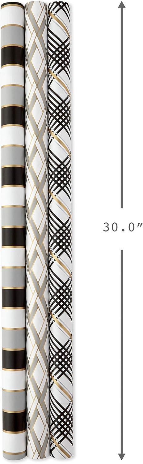 Hallmark Reversible Wrapping Paper Bundle with Ribbon & Gift Tag Stickers – Black, Gold Stripes, Plaid (3 Pack, 120 sq. ft. TTL, 30 Yds. Mini Ribbon, 36 Labels) for Graduations, Weddings, Christmas(White Black Gold Gray)