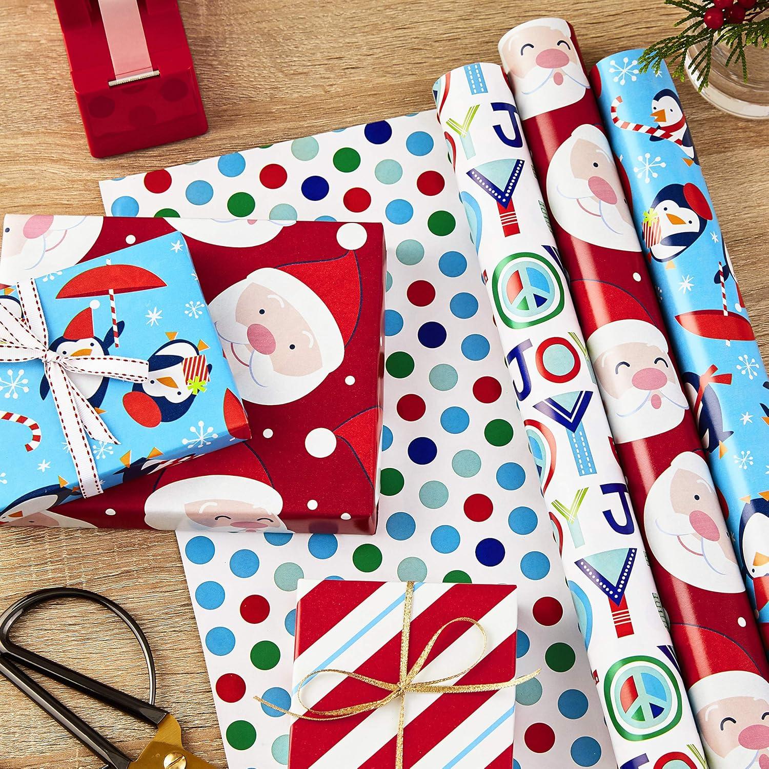 Hallmark Kraft Christmas Wrapping Paper for Kids with Cut Lines on Reverse (4 Rolls: 88 sq. ft. ttl) Penguins, Santa, Snowmen, Polka Dots(Christmas Lights Deer Snowflakes Red Green Blue Stripes)