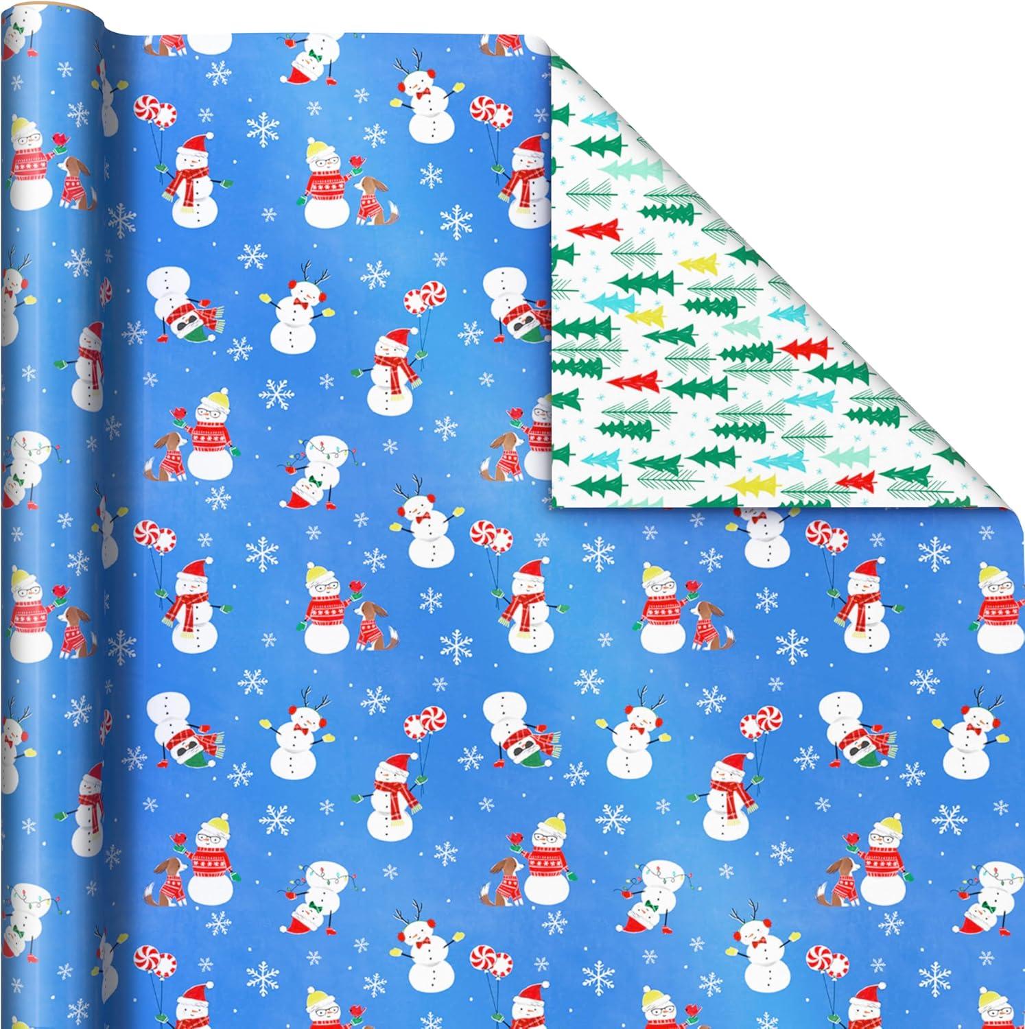 Hallmark Blue Foil Christmas Wrapping Paper with Cut Lines on Reverse (3 Rolls: 60 sq. ft. ttl) Snowmen, Snowflakes, Christmas Trees(Blue Snowman Snowflakes Trees)