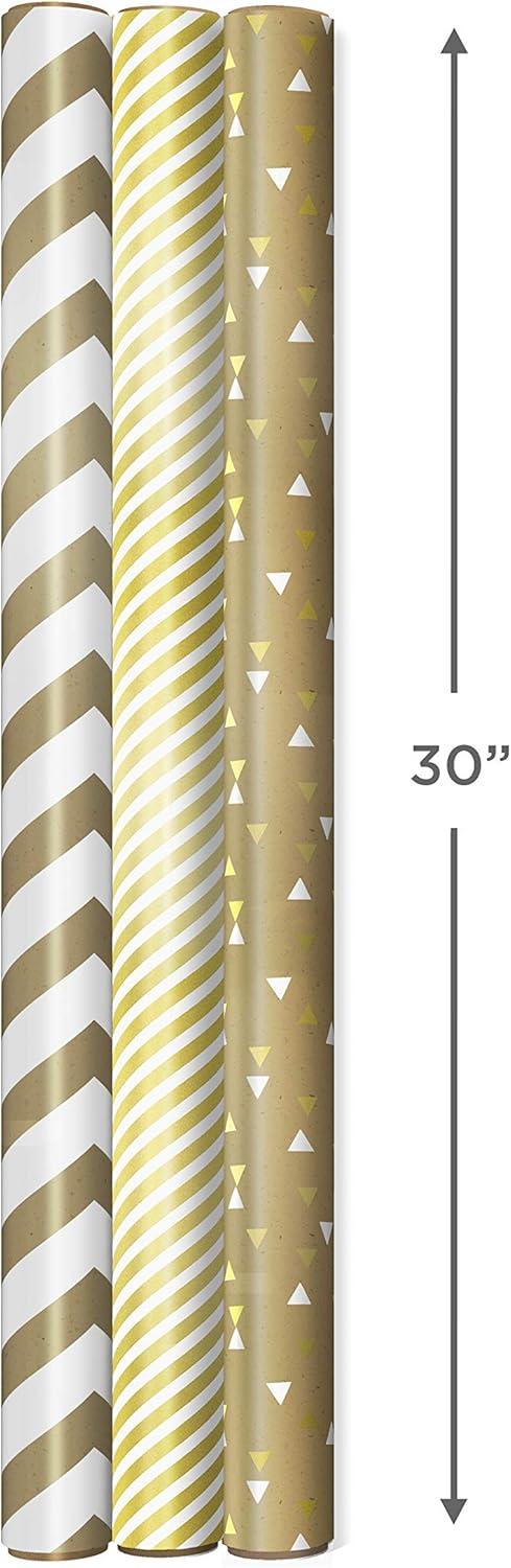 Hallmark White and Gold Wrapping Paper Rolls for Graduation, Birthday, Wedding, Bridal Shower, All Occasion – Brown Kraft Gift Wrap (Set of 3 Reversible Rolls: 75 sq. ft. ttl.)(Kraft Gold and White)
