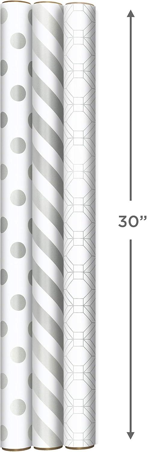 Hallmark White and Gold Wrapping Paper Rolls for Graduation, Birthday, Wedding, Bridal Shower, All Occasion – Brown Kraft Gift Wrap (Set of 3 Reversible Rolls: 75 sq. ft. ttl.)(Metallic White and Silver)