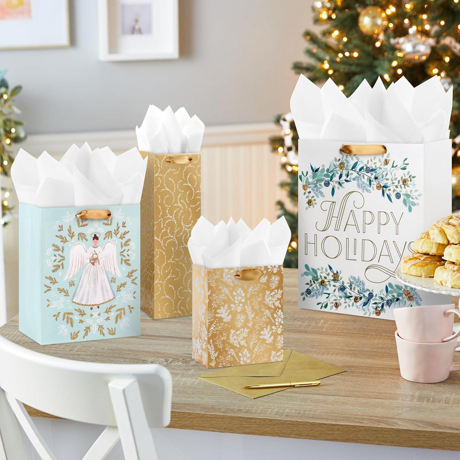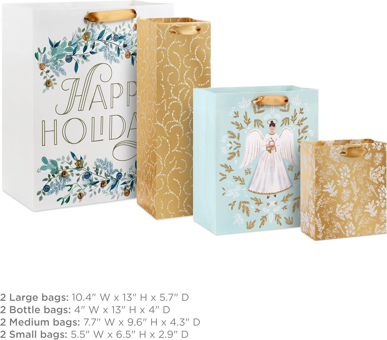 Hallmark Assorted Glittery Gold Christmas Gift Bags (8 Bags: 2 Small 6″, 2 Medium 9″, 2 Large 13″, 2 Bottle 13″) Angels, Mint Green, Leaves, Happy Holidays(Angels Mint Green Leaves “Happy Holidays”)