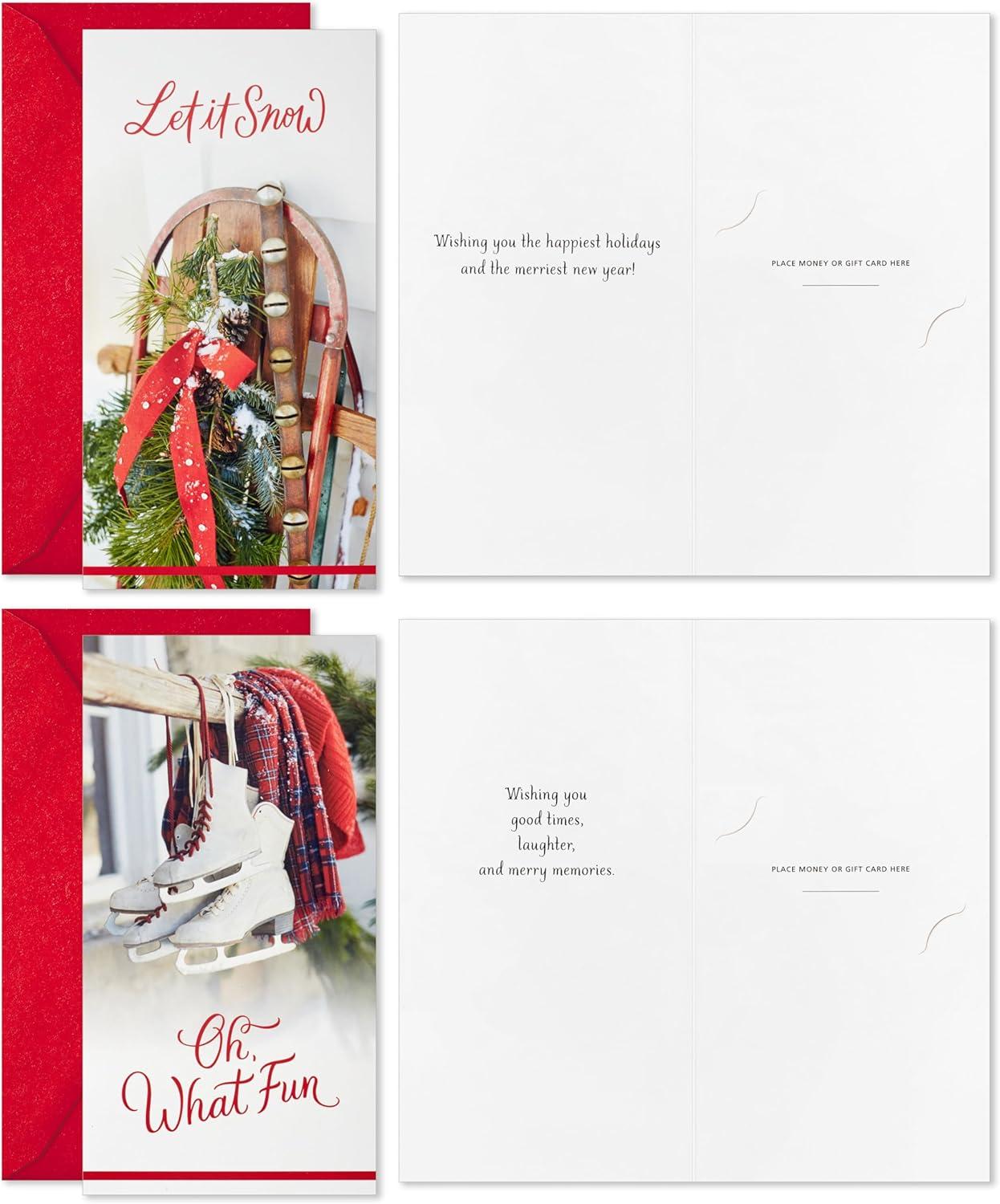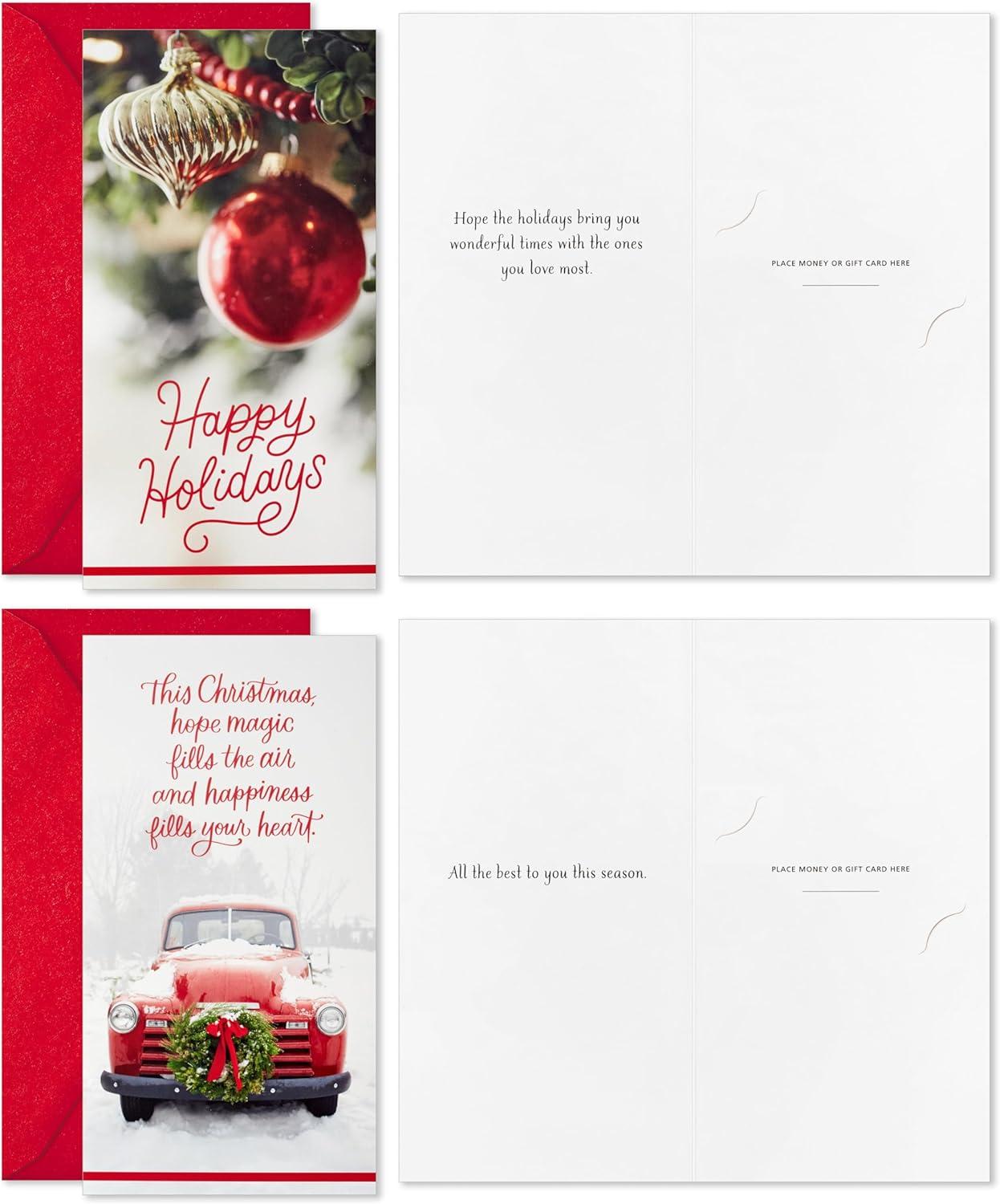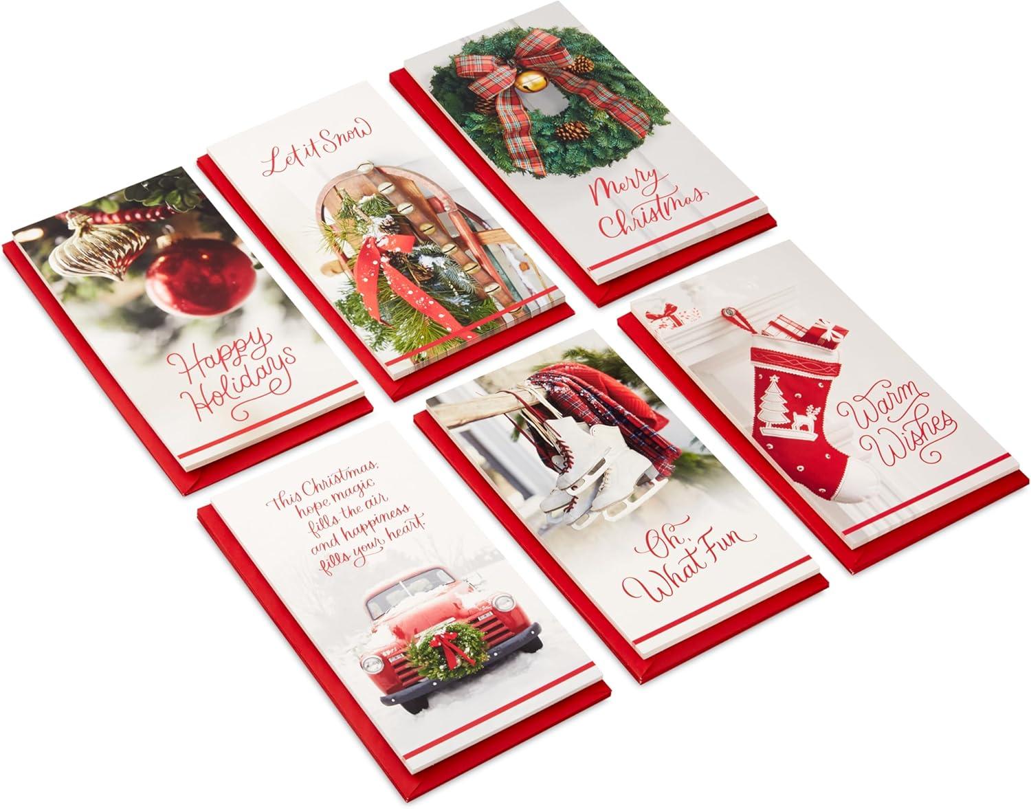 Hallmark Money and Gift Card Holder Christmas Card Assortment (36 Cards with Envelopes) Stocking, Wreath, Red Truck, Ice Skates, Sled, Red and Gold Ornaments(Warm Wishes)