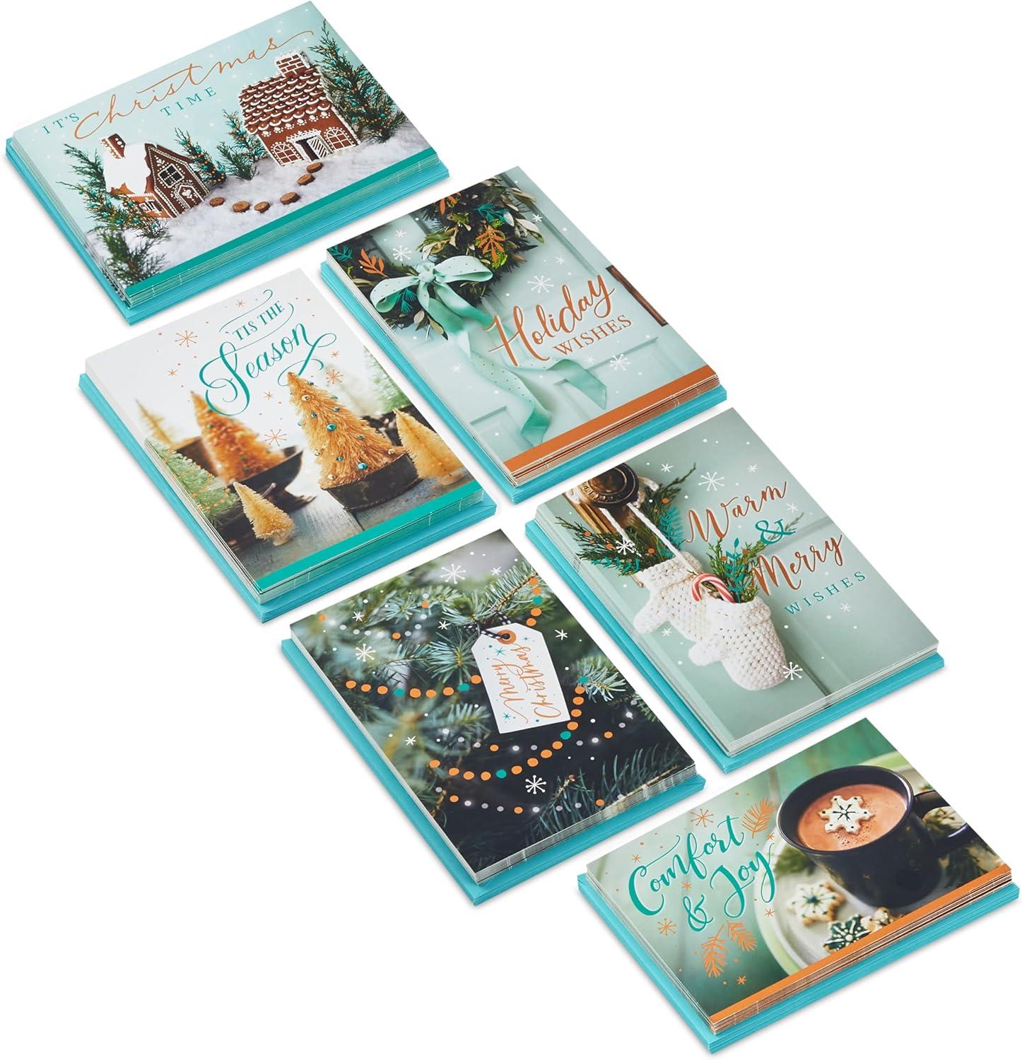 Hallmark Boxed Holiday Card Assortment (12 Cards and 12 Envelopes) Let It Snow Snowman, Gingerbread House, Hot Cocoa, Joy Wreath(Festive Foil)