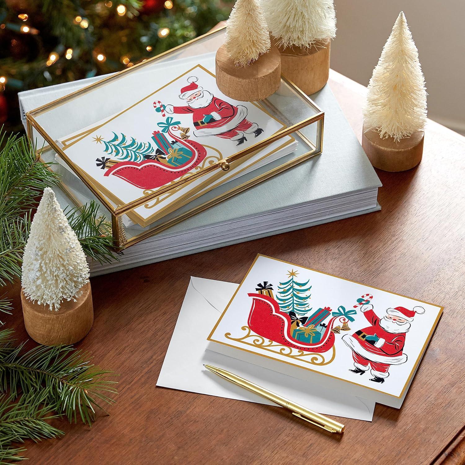 Hallmark Retro Santa Boxed Christmas Cards (16 Cards and Envelopes) Red, Black, Gold, Green, White(Reindeer in Sleigh)