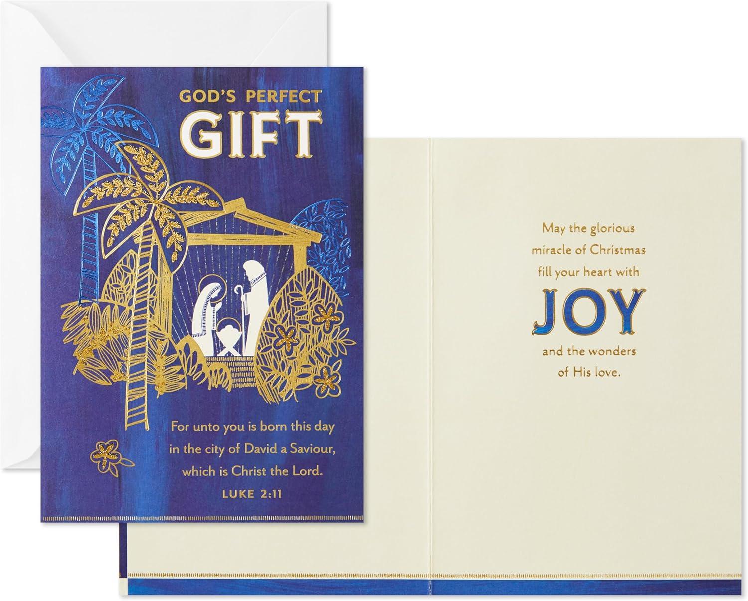 First card features a nativity scene with the message: “God’s Perfect Gift For unto you is born this day in the city of David a Saviour, which is Christ the Lord. LUKE 2:11.” Inside reads: “May the glorious miracle of Christmas fill your heart with joy and the wonders of His love.”