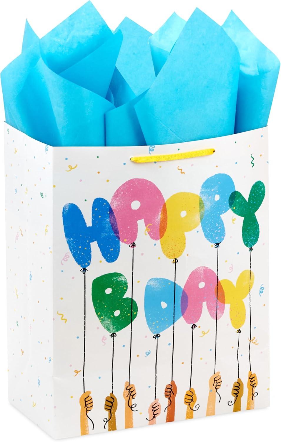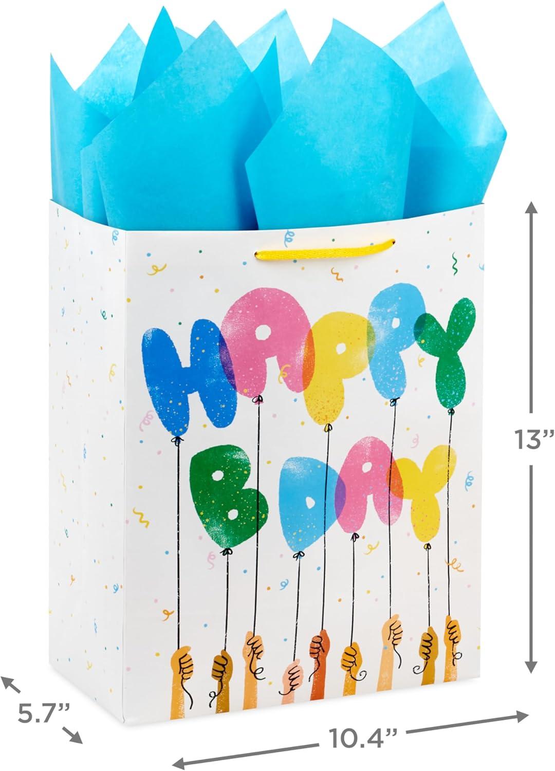 Hallmark 13″ Large Heart Gift Bag with Wedding Card and Tissue Paper (Best Wishes Gold and White, Hearts) for Weddings, Bridal Showers, Engagements(Happy Bday Balloons)