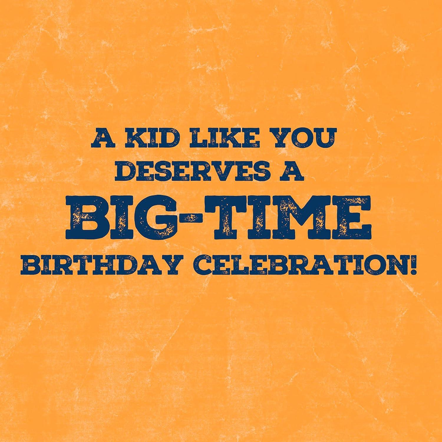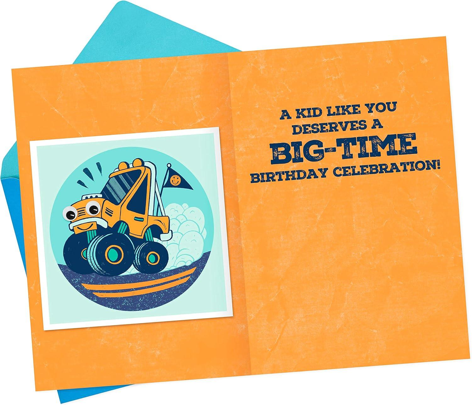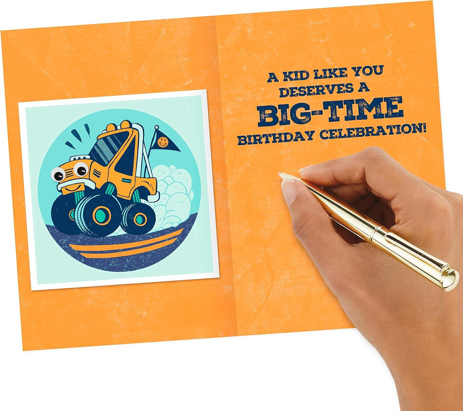 Front features a cheerful orange truck with googly eyes. Inside features a removable truck sticker and reads: “A kid like you deserves a BIGTIME birthday celebration!”