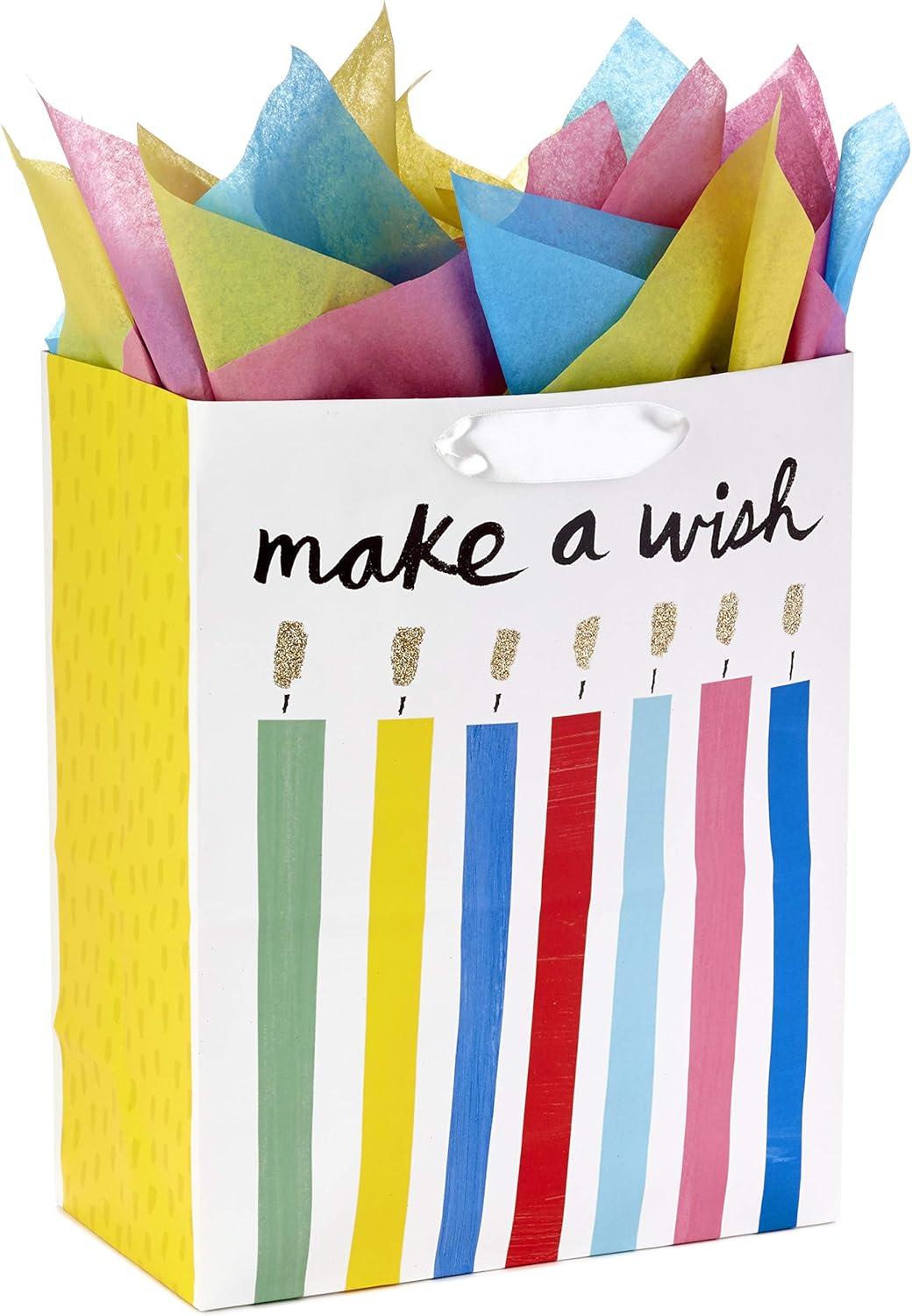 This pack of decorative gift wrapping tissue comes in eight assorted colors: lavender, turquoise, light blue, green, yellow, white, light pink, and hot pink. It's perfect for crafts, DIY projects, wrapping delicate gifts, adding cushioning to presents, and for decorative fill in gift bags and baskets. Purchase includes 15 individual sheets of each color, for 120 sheets total. Each sheet of tissue paper measures 20 inches long by 20 inches wide. Created with high-quality paper materials, all Hallmark gift bags are made with paper from well-managed forests.