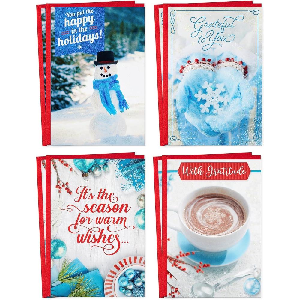 Set of Christmas cards include 4 wintry designs including snowmen, snowflakes, and cocoa with appreciative messages such as “You put the happy in the holidays! Thanks so much” and “It's the season for warm wishes…and for sending warm thanks for your thoughtfulness!”
