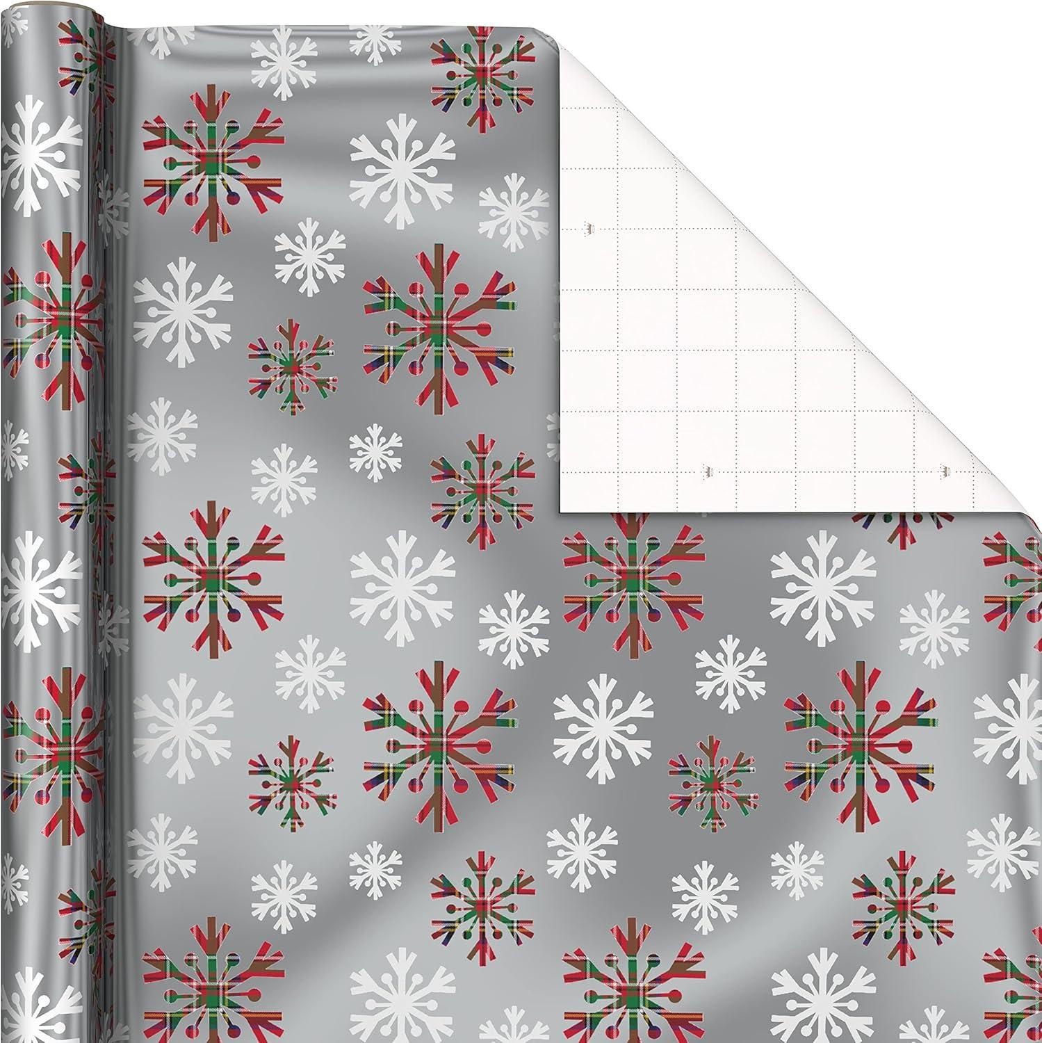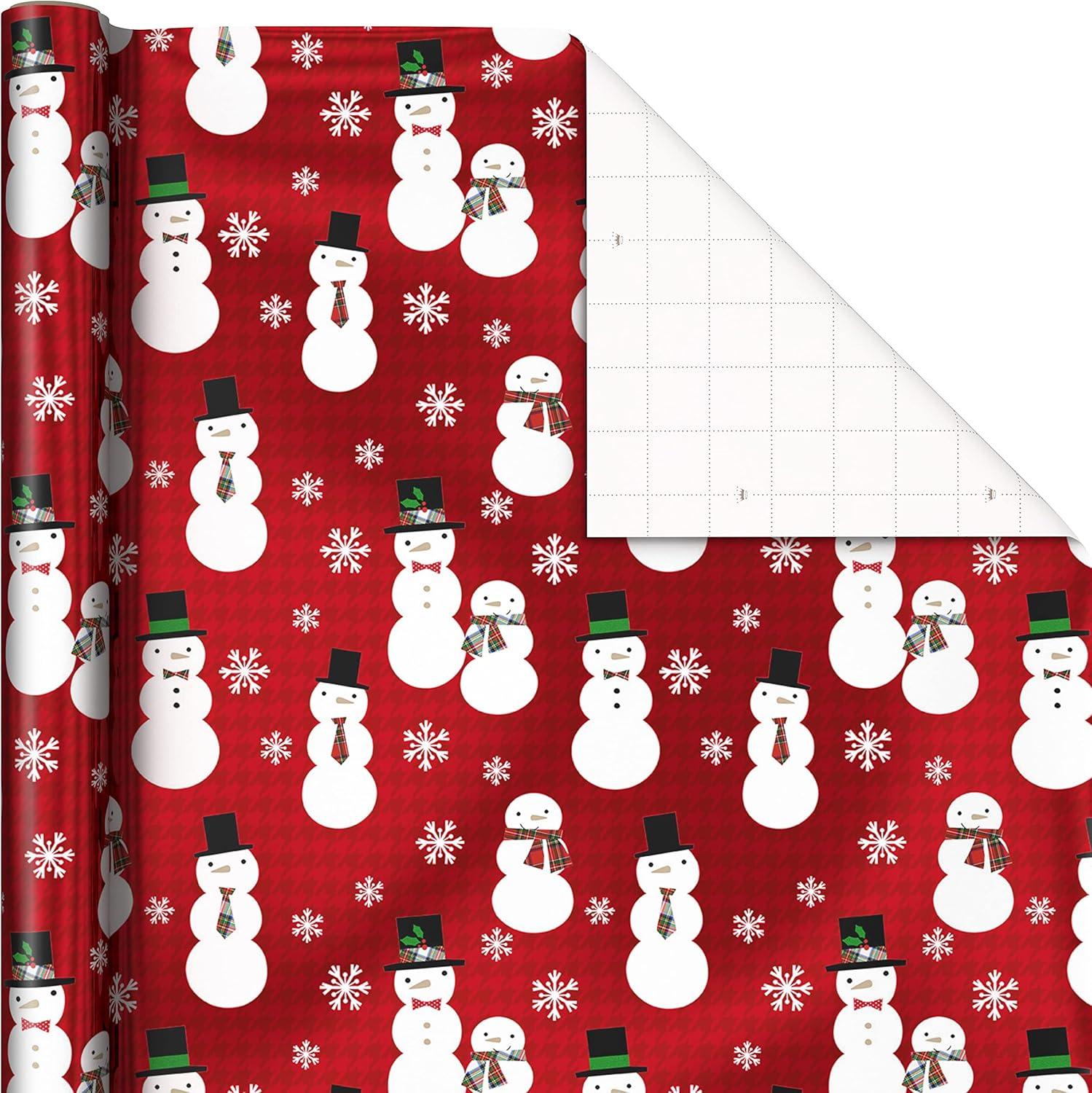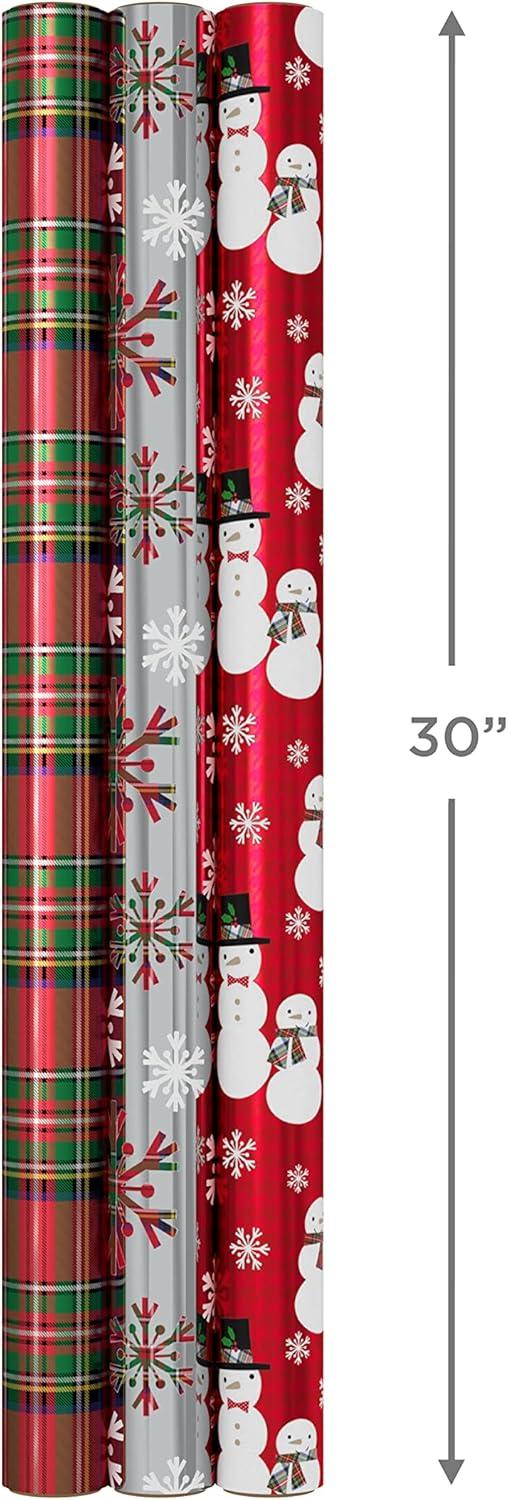 Hallmark Foil Wrapping Paper with Cut Lines on Reverse (3 Rolls: 60 Sq. Ft. Ttl) Rose Gold, Silver Trees, Gold Snowflakes for Winter Weddings, Graduations, Valentine’s Day(Red Plaid Silver Snowflakes Snowman)