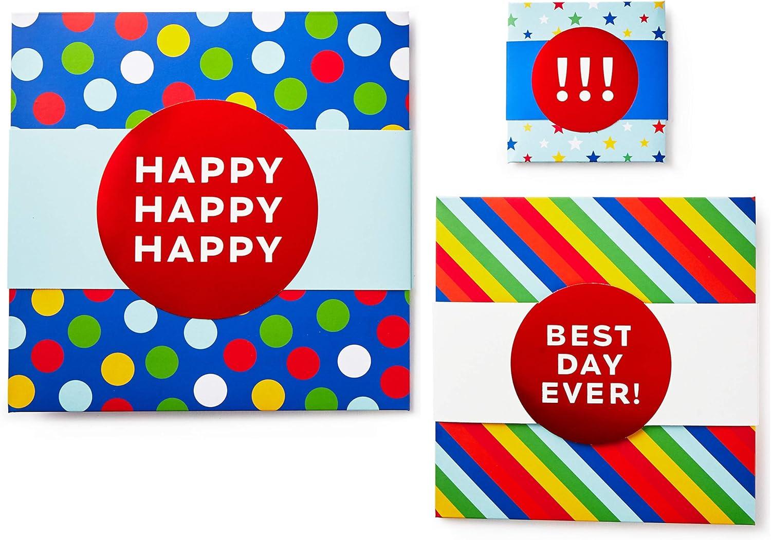 COORDINATING DESIGNS: Set of assorted gift boxes features 3 beautiful designs in cute, modern flowers, blue stripes and gold accents with coordinating wrap bands that read “A Little Something…”, “Happy Wishes,” and “Celebrating You”