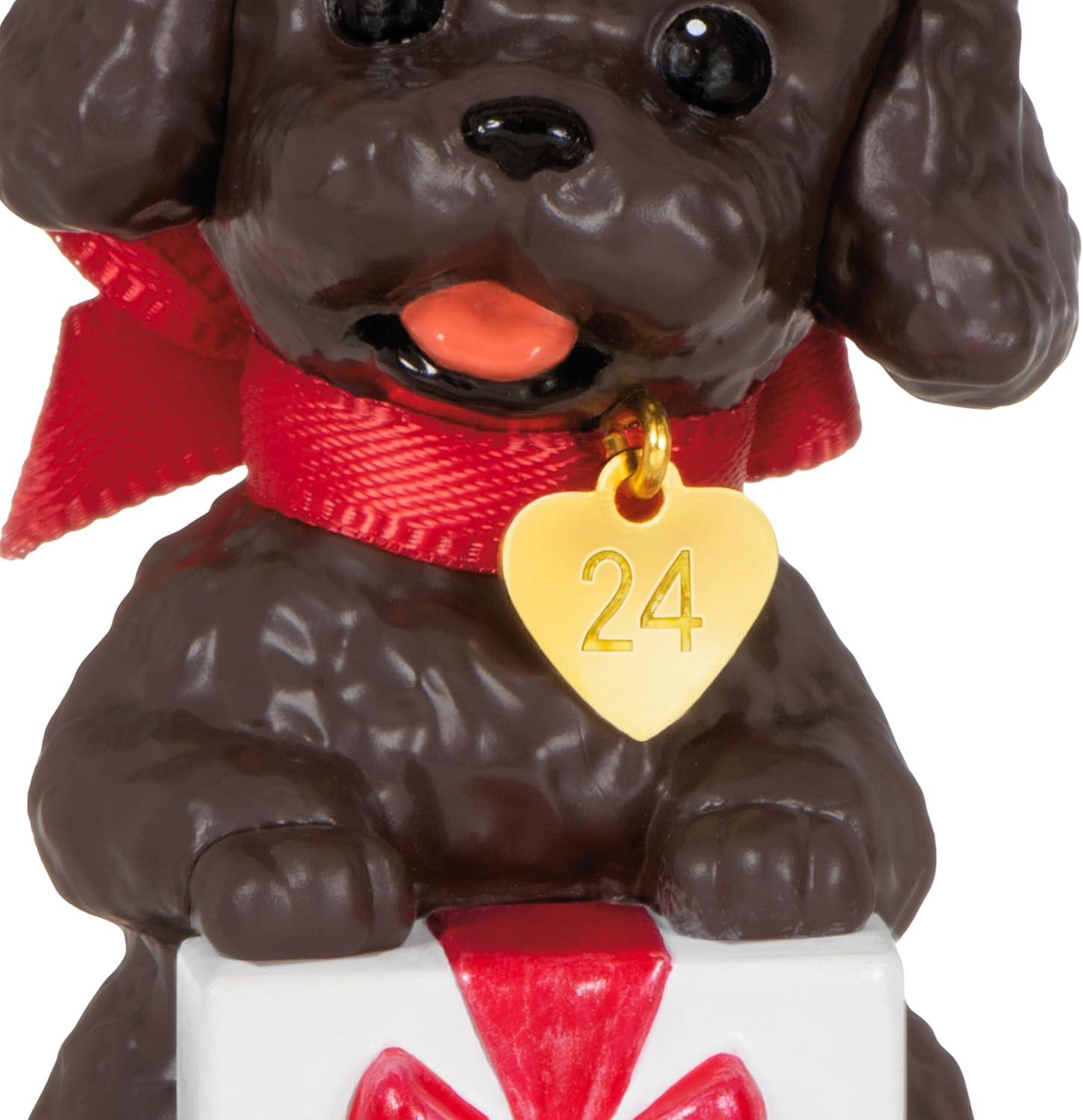 Share your love for cute and curious canine companions with this year's addition to the Puppy Love series. The Christmas tree ornament features a black poodle, just back from the salon with festive red bows adorning its ears. The adorable puppy sits with its front paws on a present, ready to get the gift unwrapping started. A red bow around pup's neck features a “24” year-dated brass heart charm. 34th in the Puppy Love Keepsake Ornament series. Message: 24 With unparalleled artistry and exceptional detail, Hallmark Keepsake Christmas ornaments are perfect for preserving precious memories, commemorating special milestones and celebrating individual hobbies and interests.