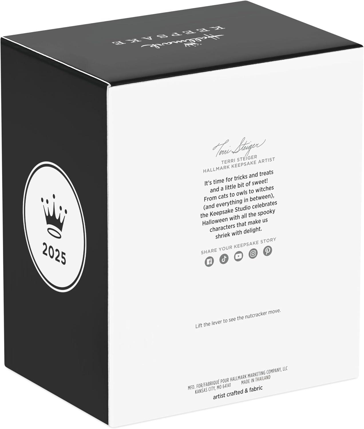 Set the stage for a stately spooky season with this Marquis Le Mew Halloween ornament. The vintage-inspired black cat nutcracker nobleman wears a dapper top hat and colorful overcoat ensemble. Holding a pumpkin-topped staff in one hand and standing on a harlequin-diamond designed base, this nutcracker decoration features a functioning lever on the back. Coordinating 2025 Noble Nutcrackers Keepsake Ornament sold separately. With unparalleled artistry and exceptional detail, Hallmark Keepsake Christmas ornaments are perfect for preserving precious memories, commemorating special milestones and celebrating individual hobbies and interests.