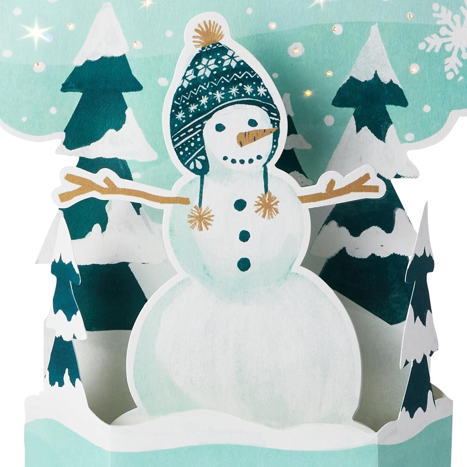 Share more merry with this cool Christmas pop-up card from Hallmark Paper Wonder. Featuring a cute snowman with snowflakes on a mint green background, this 3-D holiday card plays festive music when you press the button. Makes a great dinner table centerpiece, dorm room decoration or office holiday décor. The Hallmark brand is widely recognized as the very best for greeting cards, gift wrap, and more. For more than 100 years, Hallmark has been helping its customers make everyday moments more beautiful and celebrations more joyful.