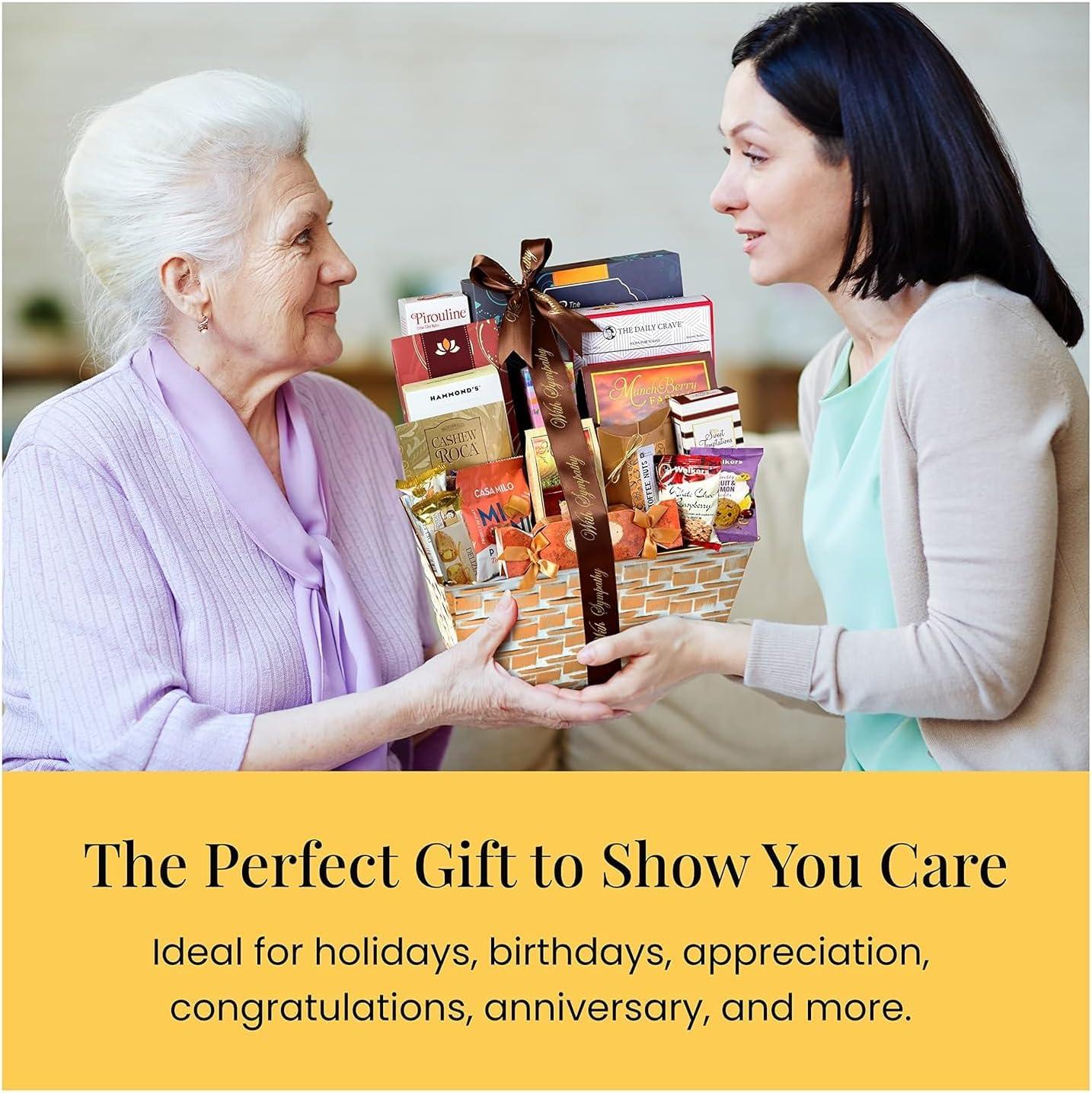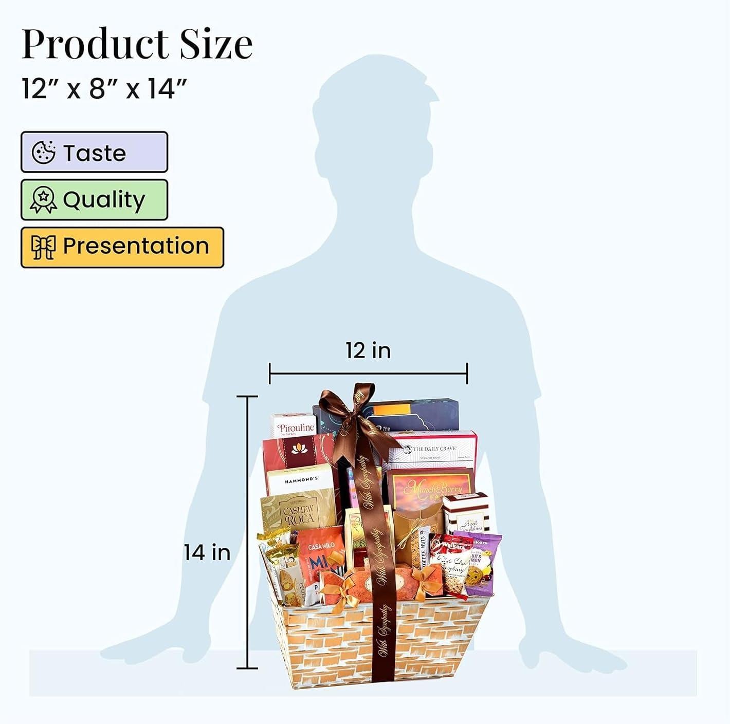 BEST-SELLING ASSORTMENT: Filled with 4 lbs of our popular snacks, selected from our customer favorites. This sympathy gift basket includes gourmet cookies, popcorn, chocolates, candy, nuts and more. Each gift basket measures 12″ x 8″ x 14″.