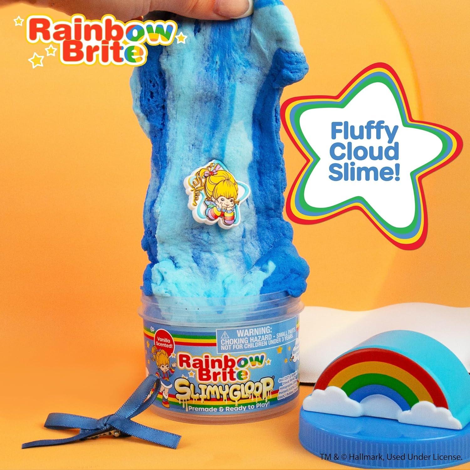 Get ready for a Rainbow-Powered sensory adventure with Rainbow Brite Scented Cloud Slime! This resealable jar of fun contains 8 ounces of two-toned blue cloud slime that smells like sweet vanilla — it even comes with a vibrant rainbow topper. Stretch, poke, and scoop the slime into a dreamy swirl, then mix in the white tinsel to make Everything Bright! Bury the Rainbow Brite charm for a sensory scavenger hunt — or save it as a keepsake and Live Colorfully! Fold it, twist it, squeeze it, then return the slime to the resealable container for more to squish later. Whether you’re expanding your slime collection or need a nostalgic gift for a friend, this slime leaves No Room for Gloom! Recommended for any fan age 6 and up.